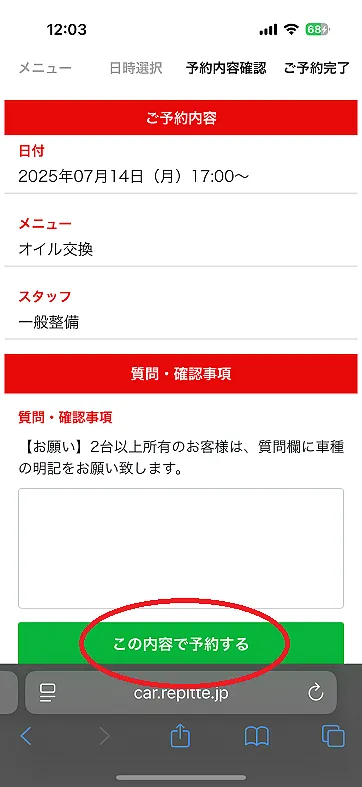 決定の場合は、この内容で予約するをクリックして下さい。
