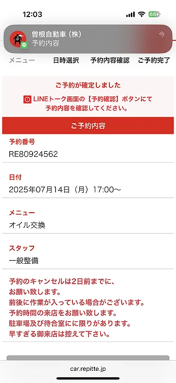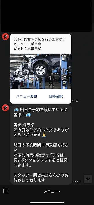 前日12時にラインで予約情報が送られます。