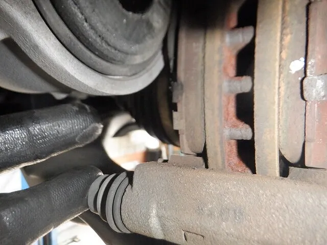 次にステアリング装置。ラックやタイロッドエンド、ステアリングギアボックスのガタつきやブーツ破れ、オイル漏れなどを点検します。