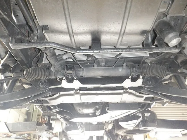 次にステアリング装置。ラックやタイロッドエンド、ステアリングギアボックスのガタつきやブーツ破れ、オイル漏れなどを点検します。