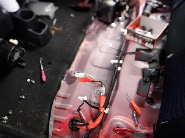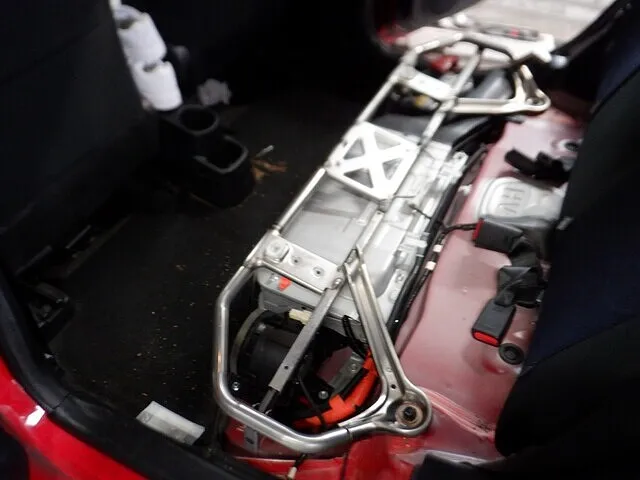 交換作業では、まず高電圧システムを安全に遮断するため、サービスプラグを取り外し、十分な放電時間を確保したうえで作業を開始します。その後、後席周辺の内装部品を丁寧に取り外し、バッテリー本体へアクセスします。ハイブリッドバッテリーは高電圧部品のため、絶縁工具の使用や安全手順を厳守しながら慎重に取り外しました。